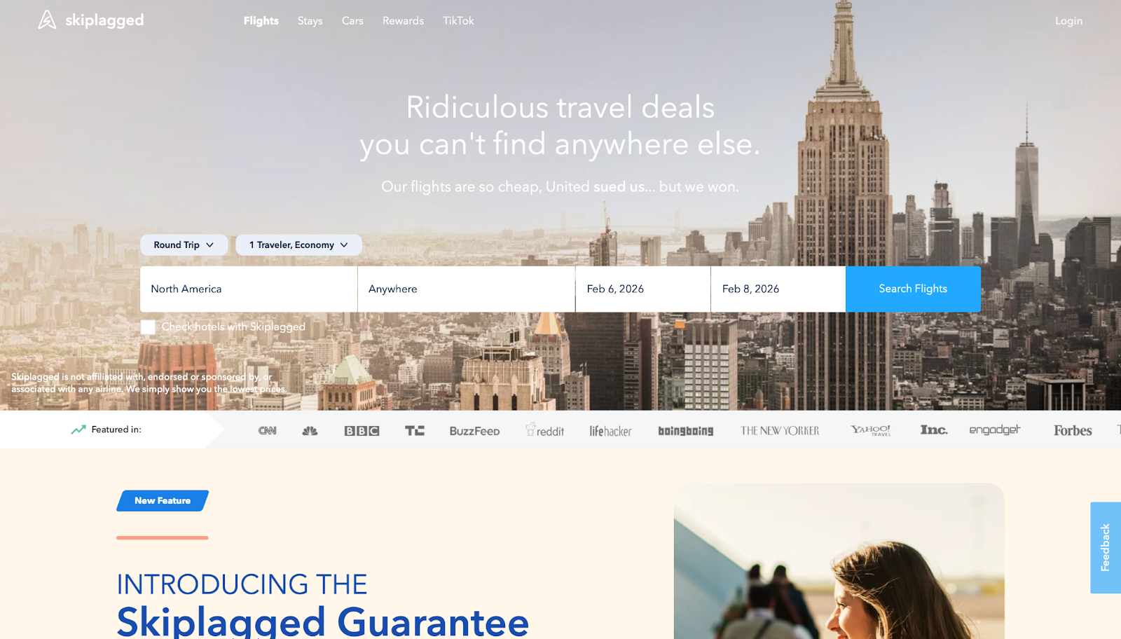 Skiplagged uncovers unconventional deals for flights from Burgas by exploiting hidden-city ticketing, where users book longer routes but exit midway for savings. It displays skiplagged rates alongside standard fares, with a guarantee protecting bookings. The site finds unique opportunities not seen elsewhere, including hotel discounts. Strengths include significant savings potential, up to hundreds off, and credits per booking.
